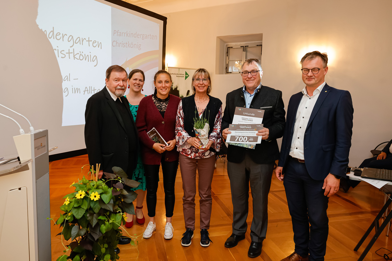 Bereits zum 16. Mal vergab der Arbeitskreis Nachhaltigkeit (AKN) der Katholischen Aktion (KA) den Diözesanen Umweltpreis, der in diesem Jahr unter dem Titel „Achtsamer Umgang mit Ressourcen“ stand. Die Bedeutung der Dankbarkeit gegenüber Gott und der Schöpfung strich Generalvikar Erich Linhardt in seinem Grußwort hervor. Er überreichte die Preise gemeinsam mit der Umweltbeauftragten Eva Heidlmair sowie mit Andreas Gjecaj, Präsident der KA-Steiermark, Martin Halmer, Ökonom der Diözese sowie Anna Kirchengast, Vorstandsmitglied des AKN. Anna Kirchengast stellte in ihrem Grußwort Bezüge zur vor 10 Jahren erschienen Enzyklika Laudato si‘, zur kürzlich durchgeführten Diözesankonferenz und den eingereichten Projekten her – sie alle sind Hoffnungszeichen für eine gute Zukunft.