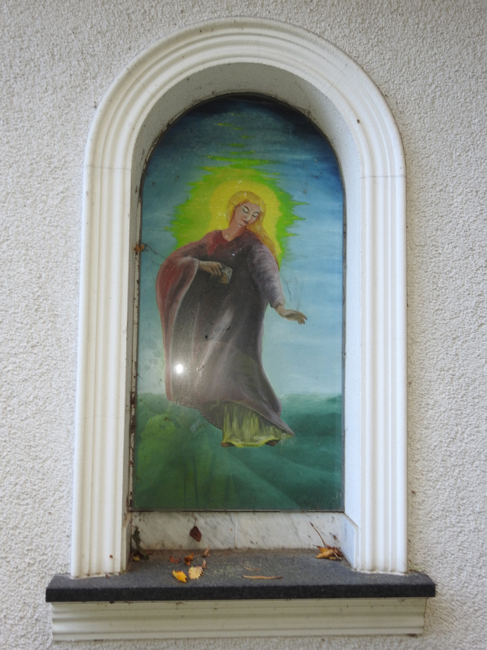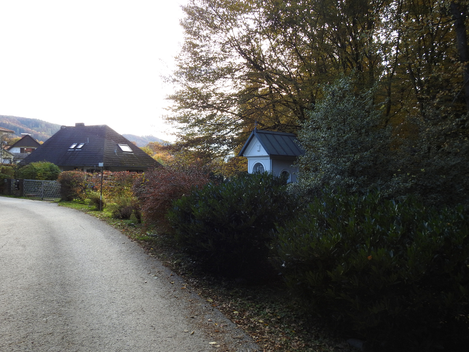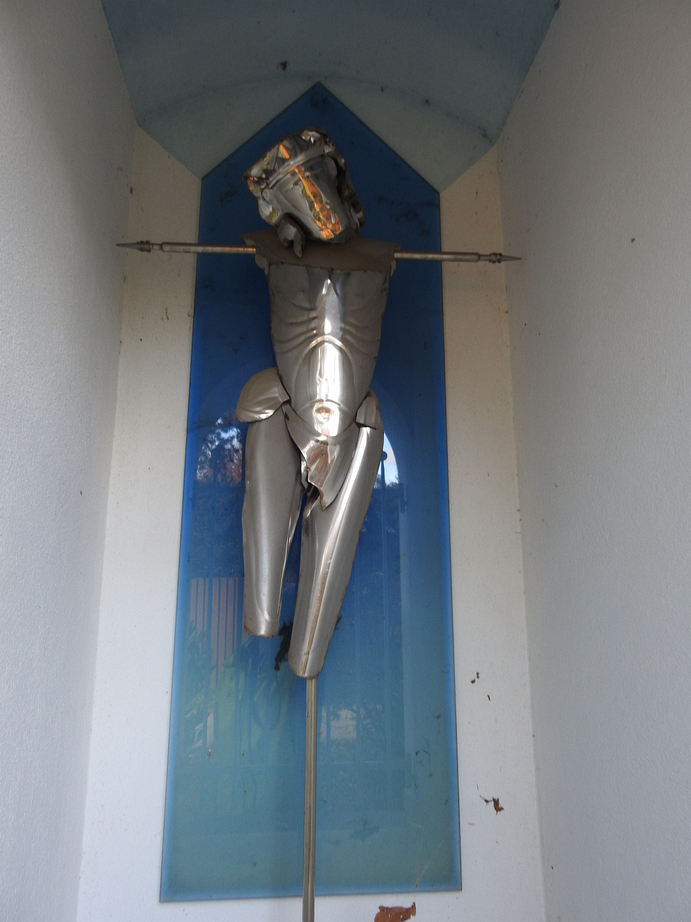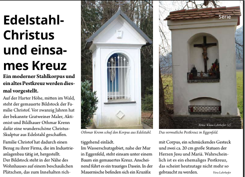 Beschreibung: Es ist ein gemauerter Bildstock mit Nischen und Malerei und schmiedeeisernem Doppelbalkenkreuz. Die Hauptnische ist mit einem kunstvollen Gittertor verschlossen. In ihr befindet sich ein stilisierter Korpus des Gekreuzigten aus Edelstahl auf einer Querstange, vom Künstler Othmar Krenn. Der Korpus hat keine Arme und keine Unterschenkel und wirkt, als ob er in der Nische schwebt, denn statt eines Kreuzes ist er auf einer dünnen Stange mit ebenso dünner Querstange, die über die Schultern hinausragt und mit Spitzen enden, befestigt. Auf den Außenseiten des Bildstocks in den Nischen sind Gemälde (auch von Othmar Krenn?), rechts ein Mann (der Heilige Josef(?)) und links eine Frau (die Heilige Maria(?).