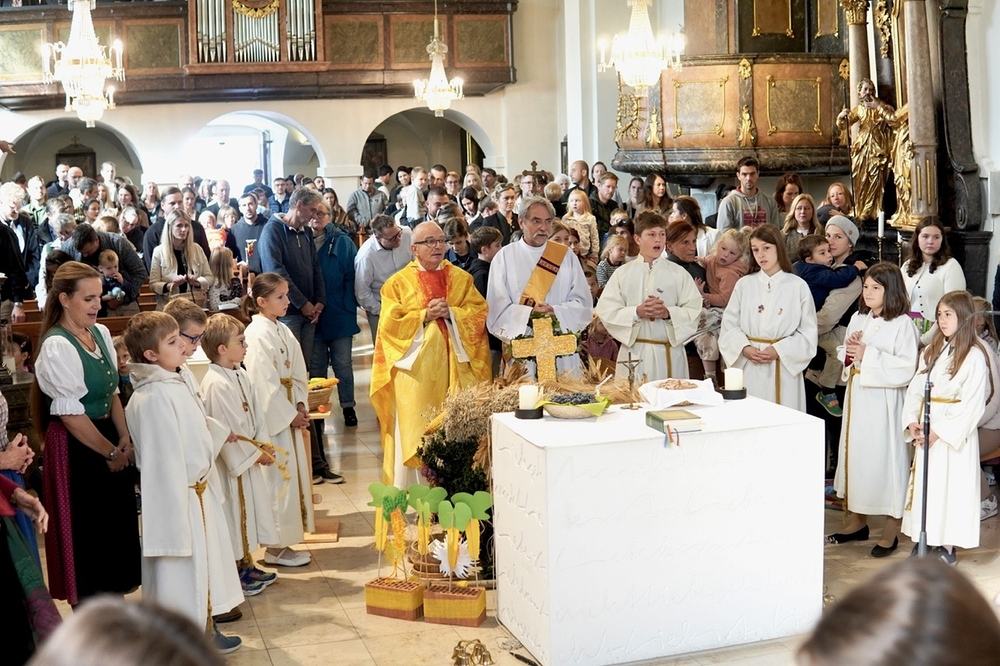 Voll Dankbarkeit und Freude feierten wir das diesjährige Erntedankfest in unserer mit großen und kleinen Leuten gut gefüllten Kirche. Vikar Norbert Glaser zelebrierte die heilige Messe, assistiert von Diakon Michi Zepf und sieben tüchtigen Minis.
