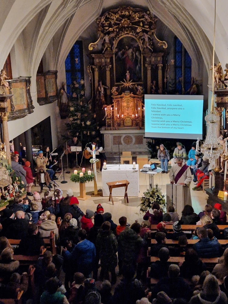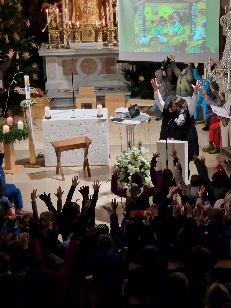Schon beim Ankommen in der Kirche erklangen viele schöne Weihnachtslieder, die zum Mitsingen einluden und auf die Feier einstimmten. In kindgerechter Erzählweise, mit schönen Bildern untermalt, wurde dann die Botschaft von der Geburt Jesu in unsere Wirklichkeit geholt.