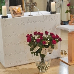 Vor dem Altar brannten 59 Teelichter für alle Menschen, die im letzten Jahr in unserer Pfarre verstorben sind. Ihre Namen wurden noch einmal laut ausgesprochen. Ein Teelicht leuchtete für alle Verstorbenen, die ungenannt blieben.